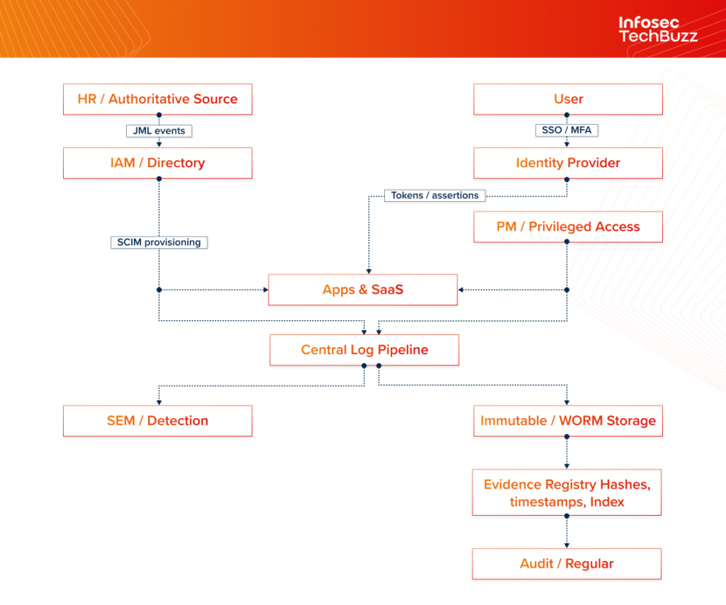 A typical audit-ready architecture separates the identity control plane (IAM/SSO/PAM/provisioning) from the evidence plane (centralized logging, immutable storage, and evidence registry) so that evidence can be produced even when production systems are compromised.
